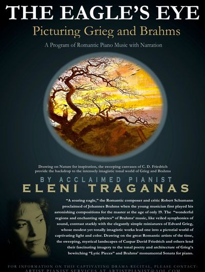“A soaring eagle,” the Romantic composer and critic Robert Schumann proclaimed of Johannes Brahms when the young musician first played his astonishing compositions for the master at the age of only 19. The “wonderful regions and enchanting spheres” of Brahms’ music, like veiled symphonies of sound, contrast starkly with the elegantly simple miniatures of Edvard Grieg, whose modest yet tonally imagistic works lead one into a pictorial world of captivating light and color. Drawing on the great Romantic artists of the time, the sweeping, mystical landscapes of Caspar David Friedrich and others lend their fascinating imagery to the tonal poetry and architecture of Grieg’s bewitching “Lyric Pieces” and Brahms’ monumental Sonata for piano.